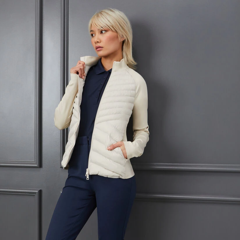 THE CARROLL HYBRID JACKET IS YOUR NEW UNIFORM FOR THE COURSE AND BEYOND. OFFERING UNBEATABLE WARMTH AND COMFORT, THIS STYLE IS MADE WITH SOFT NYLON AND A MOSSED INTERIOR. CONSTRUCTED WITH A 2-WAY FULL LENGTH ZIPPER AND HIDDEN ZIPPER POCKETS ALONG THE FLATTERING PRINCESS SEAMS, THE CARROLL PROVIDES A FEMININE, TAILORED FIT WITH JUST THE RIGHT AMOUNT OF TECHNICAL DETAILS. G4LS22O16
