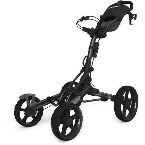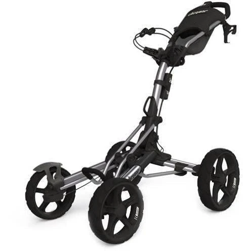 Two major design improvements on four wheel cart design include dual front brakes and dual front wheel alignment. The dual front brakes allow for the cart to be quickly maneuvered around the green with the brake on. The Dual front wheel alignment makes this the first four wheel cart that can actually be adjusted to do straight.
