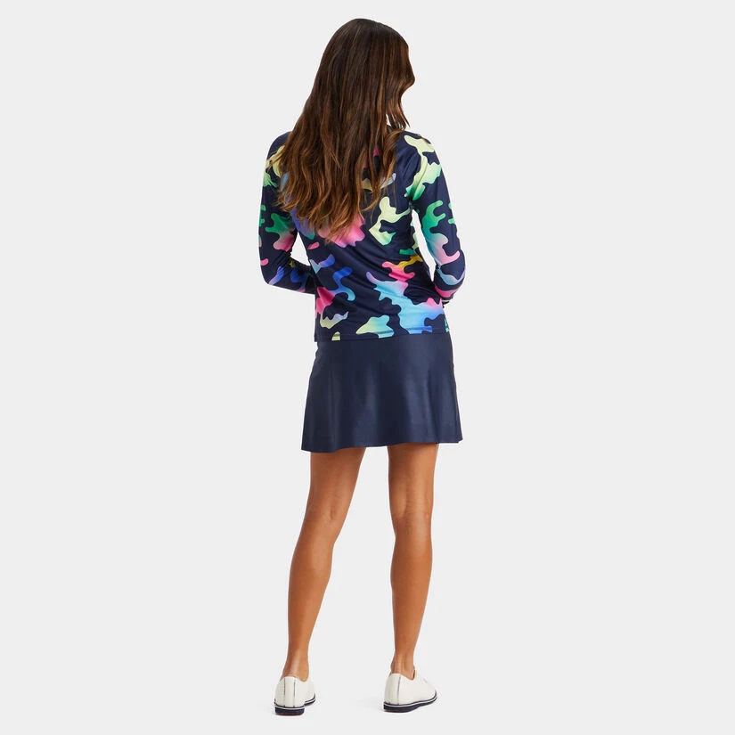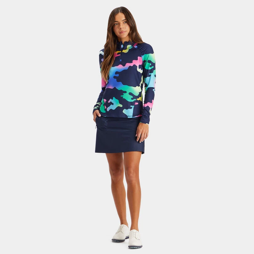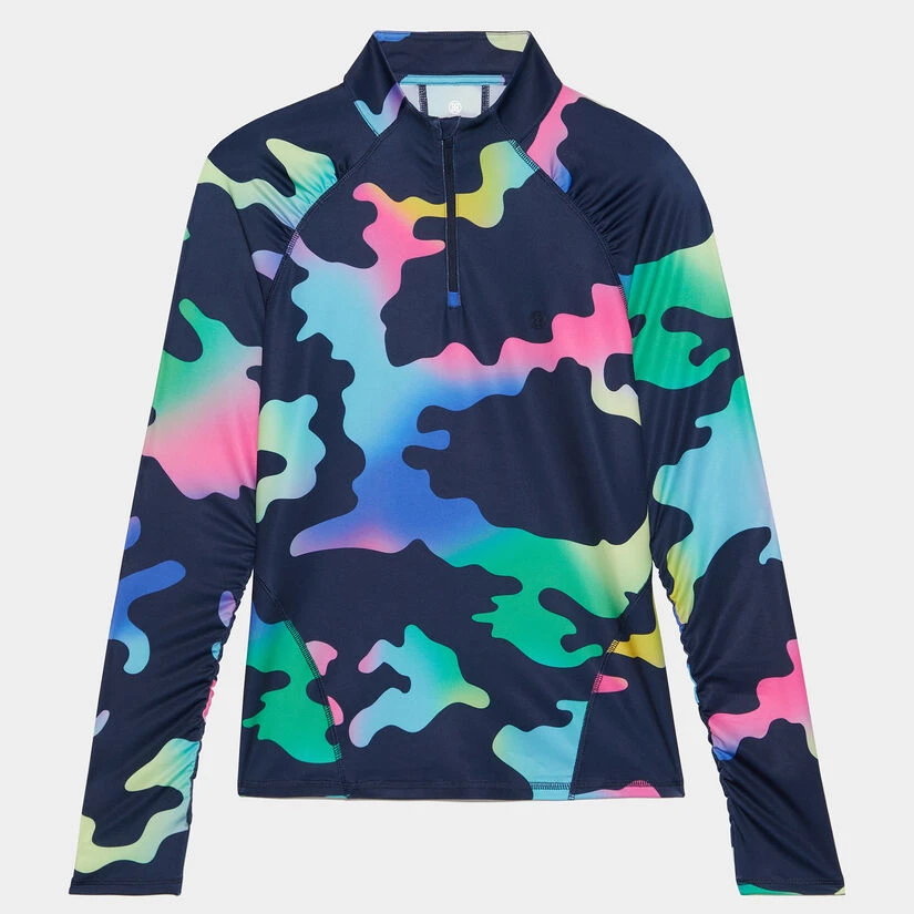 SHOW OFF YOUR COMFORT AND STYLE WITH THE COLOUR BLEND CAMO JERSEY QUARTER ZIP MID LAYER. THIS STANDOUT LAYERING PIECE IS MADE WITH TECH JERSEY FABRIC AND FEATURES A COLOURFUL CAMO PRINT THROUGHOUT. PLUS, ROUCHING AND CONTRAST STITCHING PROVIDE A FLATTERING CONTOUR EFFECT AS AN ADDED PERK. G4LS23K565