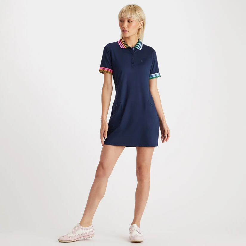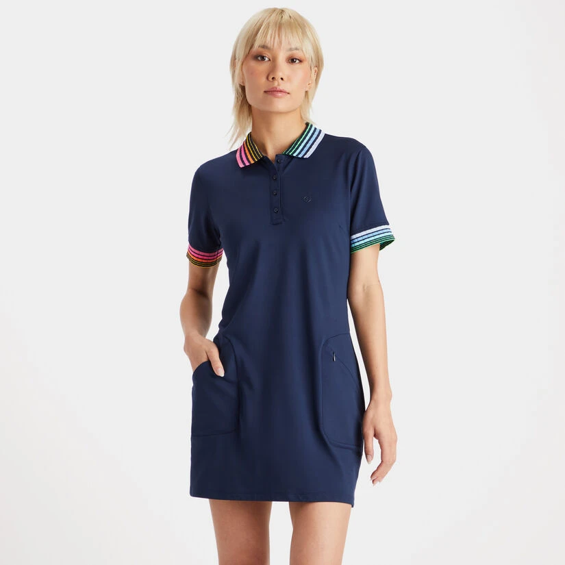 THE PLEATED CONTRAST COLLAR PIQUÉ POLO DRESS IS DESIGNED WITH BREATHABLE PIQUÉ FOR COOL PLAY ON AND OFF THE COURSE. THIS CLASSIC STYLE STILL SPORTS PERFORMANCE FEATURES SUCH AS SIDE POCKETS WITH ZIP CLOSURE, PERFECT FOR STORING YOUR SCORE CARD. G4LS23D11